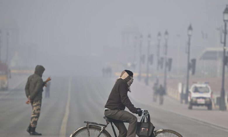 Cyklista viděl 13. ledna 2026 za mlhy a zimních mrazů kryt překračující stezku Kartavya v Novém Dillí. Fotografický kredit: SHIV…