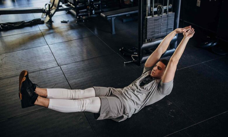 4. Opakujte pro 12–15 opakování a udržujte záda přitlačené do podlahy pod sebou pro maximální zapojení jádra.