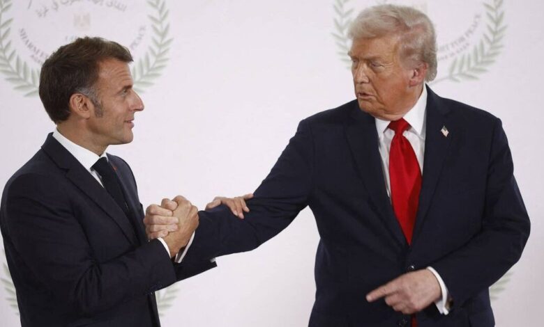 Prezident Donald Trump pozdraví francouzského prezidenta Emmanuela Macrona během summitu světových vůdců o ukončení války Gazy (Obrázek: Getty Images)