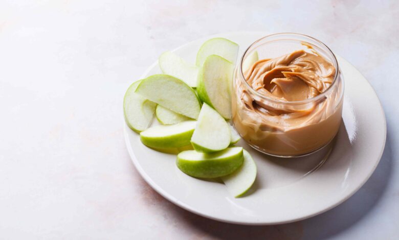 mám arašídové máslo s jablko, banán nebo datle. Arašídové máslo přidám ke všemu, ale miluji ho spárovat s ovocem jako zdravou svačinku nebo dezert s vysokým obsahem bílkovin.