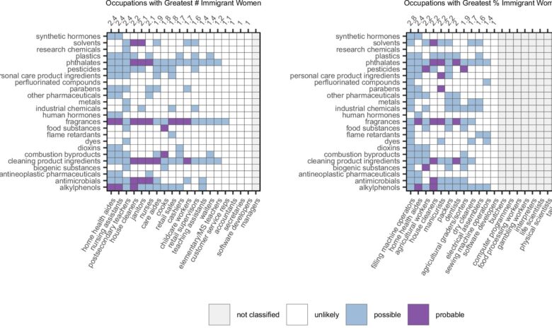 Levý panel ukazuje pravděpodobná a možná chemická expozice způsobená povoláními, která zaměstnávají největší počet imigrantek v USA, zatímco pravý panel ukazuje pravděpodobná a možná expozice způsobená americkým kreditem: Journal of Exposure Science & Environmental Epidemiology (2025). DOI: 10.1038/s41370-025-00808-9