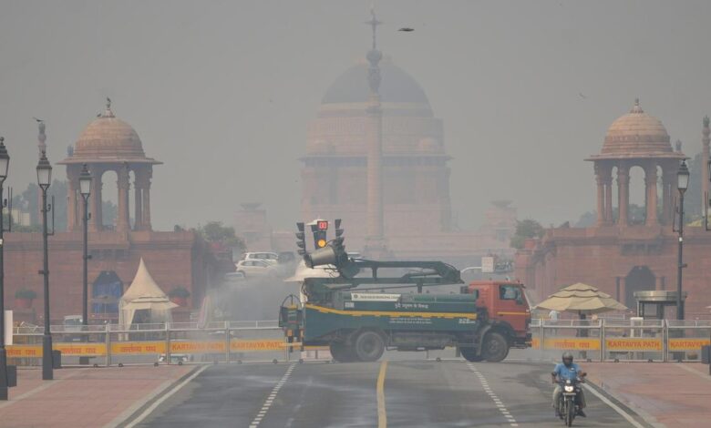 Smogová pistole rozstřikující vodu, aby v úterý kontrolovala znečištění na Kartavya Path v Novém Dillí. | Fotografický kredit: ANI