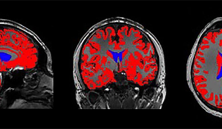 MRI obraz mozku s postranními komorami zbarvenými modře. Komory jsou naplněny mozkomíšním mokem. Kredit: RIKEN
