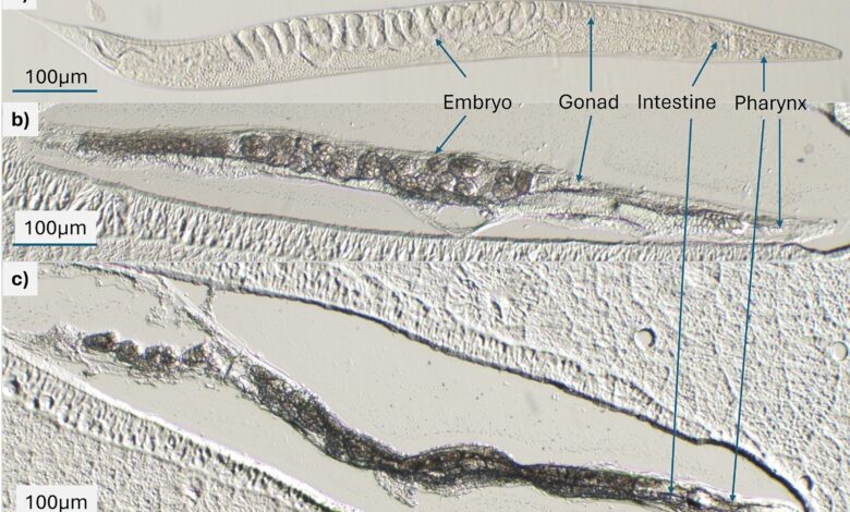 Porovnání intaktních nematodů a nematodových sekcí. (a) Brightfield obrázek neporušené nematody. (B, C) Brightfield obrázek po sobě jdoucích řezací hlístice. Šipky označují různé části anatomie C. elegans odpovídající mezi sekcemi a intaktním nematodem. Kredit: Vědecké zprávy (2025). Dva: 10.1038/S41598-025-09577-9