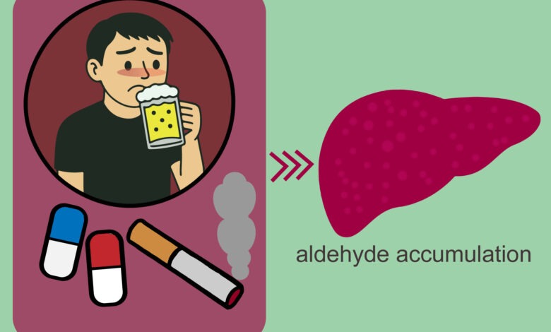 To následně způsobuje, že se aldehydy hromadí v játrech, což způsobuje vážné poškození jater. Jejich mechanismus naznačuje poškození, které může být způsobeno u lidí po vystavení vysoké úrovni akroleinu, zejména u osob s variantou genu ALDH2*2.
