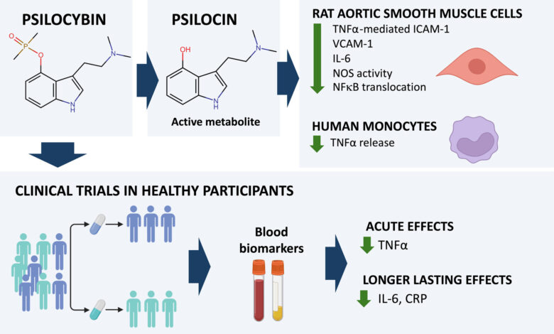 Protizánětlivé působení psychedelického léčiva, psilocybinu, v klinické studii a dopad aktivního metabolitu, psilocinu, na izolované buňky in vitro. Kredit: British Journal of Pharmacology (2025). Dva: 10.1111/bph.70138