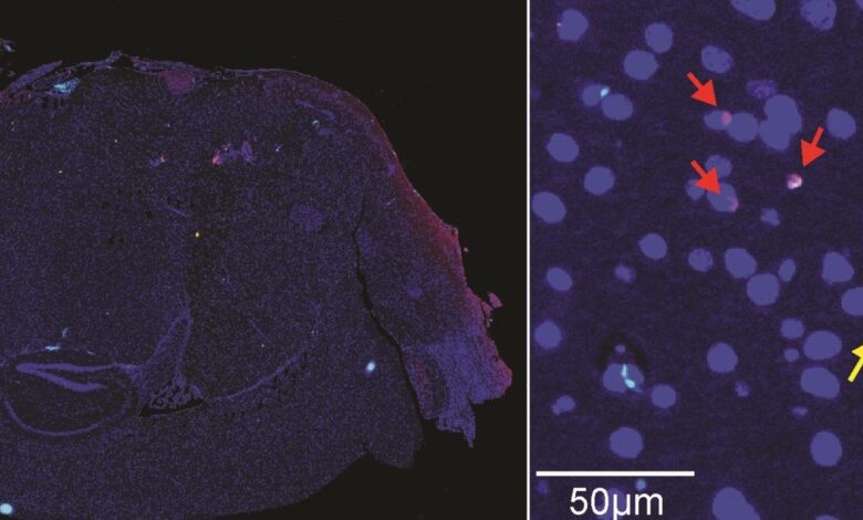 Zobrazování myší mozkové tkáně, zobrazující buňky B-1A (červené šipky) identifikované v myším modelu pro roztroušenou sklerózu. Odstranění TCF1 a LEF1 vedlo k dysfunkčním B-1A buňkám, které nebyly schopny kontrolovat zánět v tomto modelu. Kredit: Sophie Shen, Příroda.