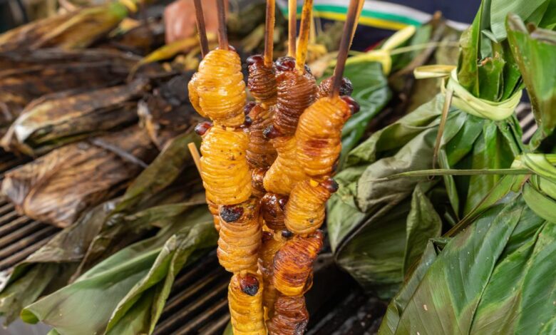 Jedlé palmy Weville Larvae (Rhynchophorus Phoenicis) na tradičním trhu s potravinami v Puerto Francisco de orellana, Ekvádor. | Fotografický kredit: Getty Images/StockPhoto