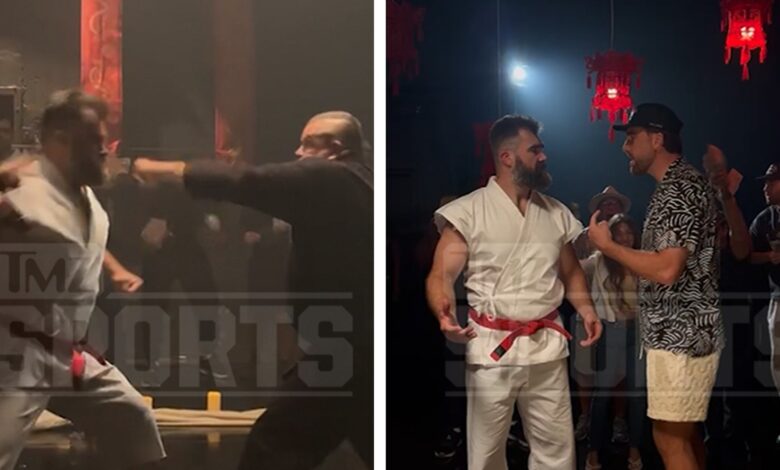 Jason Kelce Films Beer Commercial With Travis, Chuck Liddell, vezme falešný úder