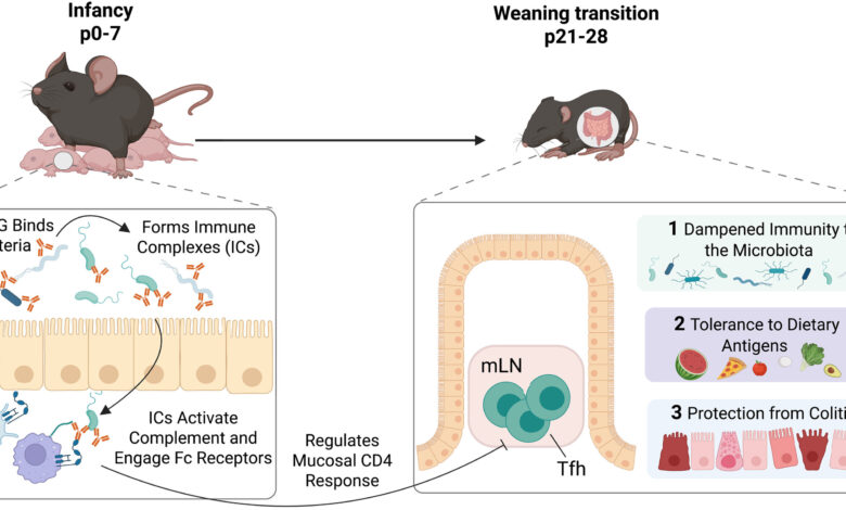 Přijímání mateřských protilátek v prvním týdnu života zabránilo přehnanému imunitním reakcím později. Bez časných protilátek se mladé myši vyvinuly nadměrné T folikulární pomocné buňky a B buňky ve střevních tkáních po odstavení. Pro přehnané imunitní odpovědi ve střevních tkáních byly vyžadovány střevní mikroby.