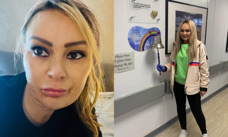 O tři měsíce později další nemocniční skenování z krku nevykazovalo žádné známky rakoviny a zazvonila zvonek, aby oslavila získání všestranného.