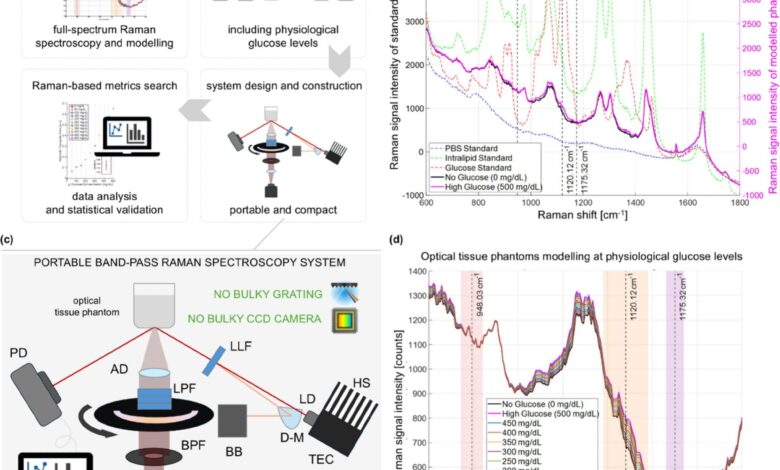 Chcete-li tyto výzvy řešit, S výzkumníci vyvinuli kompaktní, neinvazivní, přenosný senzor založený na Ramanově spektroskopii využívající pásmovou Ramanovu spektroskopii (BRS) přístup pro kontinuální monitorování glukózy. Ramanova spektroskopie je technika, která vyzařuje blízké infračervené nebo viditelné světlo na tkáně nebo buňky, aby se odhalilo jejich chemické složení. Základním principem je analyzovat, jak je blízké infračervené nebo viditelné světlo rozptýleno nebo odkloněno, když se setkává s různými druhy molekul v tkáních nebo buňkách.