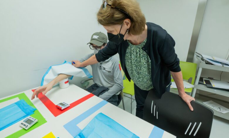 Dr. Kirsten Lyke se studijní dobrovolnicí, která byla vystavena infekčním komárům přenášejícím parazita malárie. Credit: University of Maryland School of Medicine