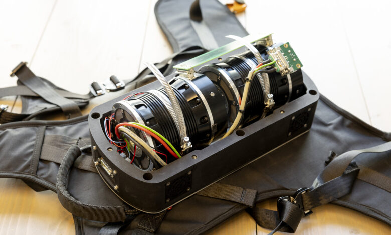 Batoh, známý jako Gyropack, používá gyroskopickou technologii podobnou té, která se používá ve vesmírných stanicích nebo velkých satelitch k udržení orientace v prostoru. Kredit: Delft University of Technology