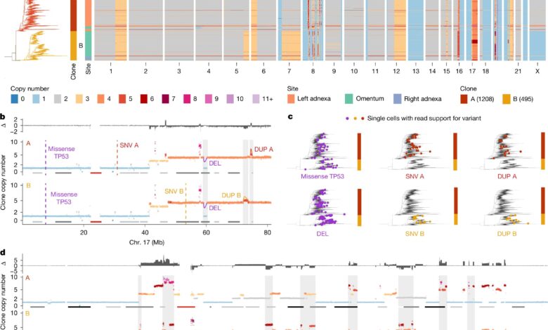 Mutace specifické pro klon a strukturální změny v SCWG. ATepelná mapa založená na kopii na bázi SCWGS pro pacienta OV-004. Každý řádek je číslem kopírování buňky, buňky jsou uspořádány podle fylogeneze s jednobuněčnou fylogenií MedicC2 (zobrazeny vlevo). bClone Pseudobulk Číslo kopie při rozlišení 10 kB na Chr. 17 pro klony A a B. Truncal varianty (TP53 Missense a delece) jsou anotovány ve fialové, klonově specifické duplikace a SNV jsou anotovány červeně a žlutě. CFylogenetické stromy anotované buňkami, které mají podporu pro varianty uvedené v b. dClone Pseudobulk Číslo kopie při rozlišení 10 kB na Chr. 8 pro klony A a B vykazující divergentní chromothripsis na chr. 8. in b a dPozoruhodné regiony, které se liší mezi klony A a B, jsou zvýrazněny šedou a absolutní rozdíl (δ) mezi stavy kopií je zobrazen v horní trati. Kredit: Příroda (2025). Dva: 10.1038/S41586-025-09580-0
