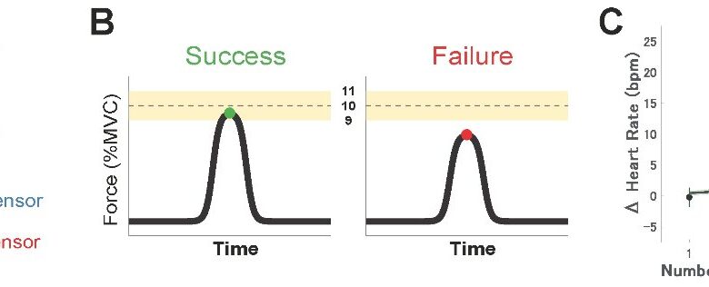 (A) Experimentální nastavení pro úkol síly konečky prstu, kde účastníci stiskli senzor síly, aby odpovídal cílové síle. (B) Příklad pokusu ukazující silový výkon, kde úspěch vyžadoval zůstat v rozmezí 10 % tohoto cíle. (C) Srdeční frekvence se výrazně zvýšila s počtem po sobě jdoucích úspěchů. Kredit: 2025 Yamada, Miyata a Kudo. CC-BY-ND