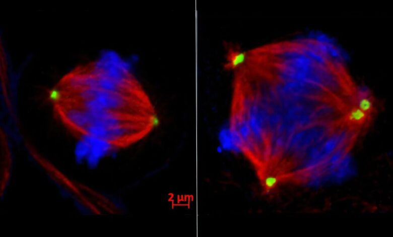 Tým zjistil, že EZH2 umlčí gen tanaserázy 1, který obvykle zajišťuje, že stroj oddělující chromozom funguje správně během dělení buněk. To spustí a řetězová reakce– Snížení tankkyrázy 1 způsobuje, že další protein zvaný CPAP se příliš vytváří. To vyvolává centrosomy buňky – struktury, které se chromozomy rozkládají od sebe, aby nekontrolovatelně vynásobily, což vede k vadným rozdělením do tří nebo více dceřiných buněk.
