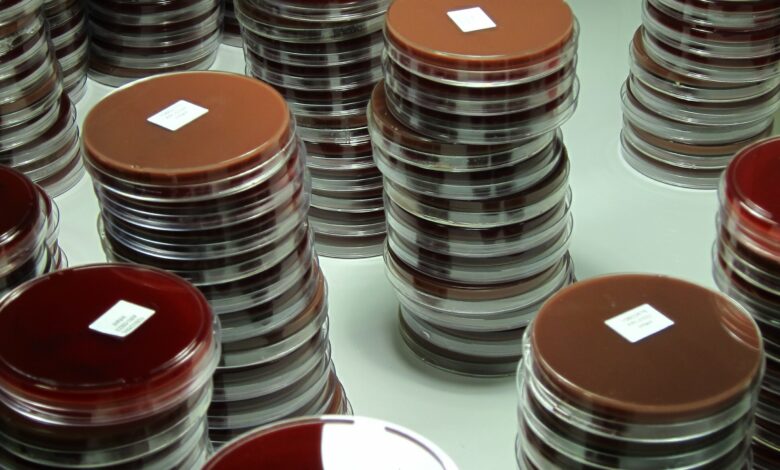 Stohy Petriho misek s červeným agarem jsou úhledně uspořádány v laboratoři, obsahující nebo připravené pro bakteriální kolonie. Kredit: Paul Turner