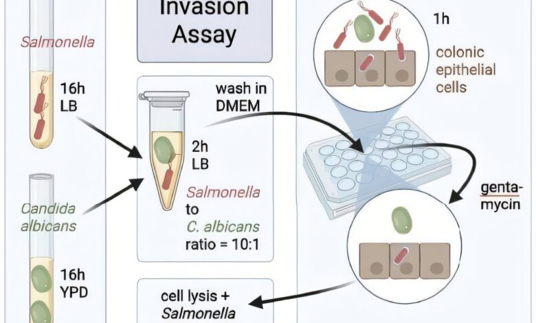 Candida ve střevech vedla k vyššímu zatížení salmonel ve tlustém střevě a více bakteriím dosahujících slezinu a játra, přičemž koinfikované myši ztrácí větší váhu. Candida také zvýšila vstup Salmonella do lidských buněčných linií tlustého střeva. Odečty genů ukázaly, že Salmonella’s Invasion Machinery se zapnul poblíž Candidy.