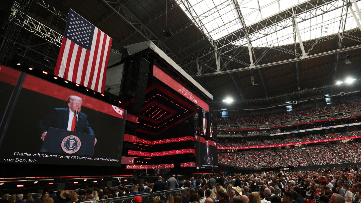 Americký prezident Donald Trump hovoří o veřejné pamětní službě pro Charlie Kirk na stadionu State Farm Stadium v Glendale v Arizoně 21. září 2025. (Patrick T. Fallon/AFP/Getty Images)