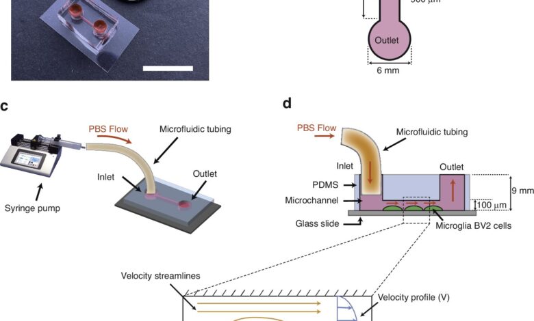 Mikrofluidní platforma umožňuje vědcům studovat, jak mikroglie – mozek Imunitní buňky– Reagují na malé, toxické shluky proteinových fragmentů známých jako amyloidní beta oligomery (ApO). Tyto fragmenty jsou považovány za klíčový marker nemoci.