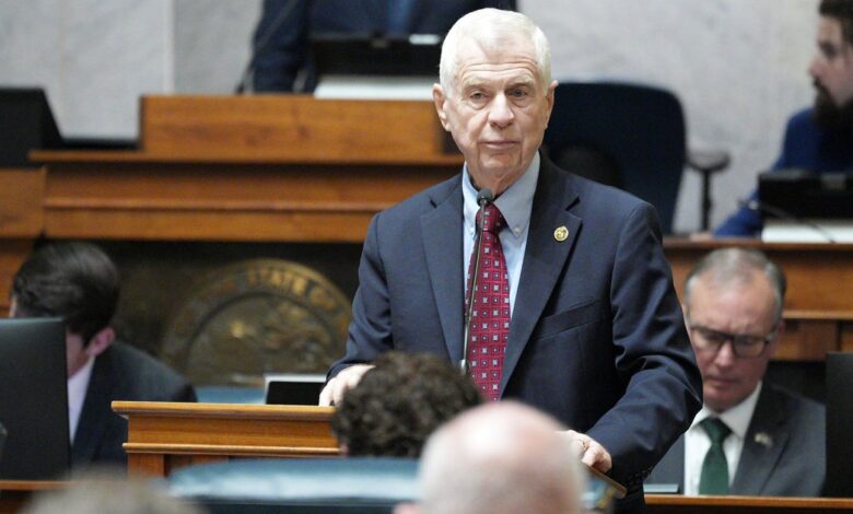 Jeden z protějšků, státní senátor Ed Charbonneau hovoří v senátu Indiana v Indianapolis. AJ Mast/AP
