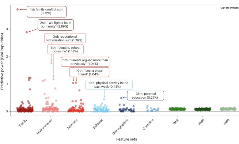 Rodinné boje byly nejlepším prediktorem současných symptomů v obecné psychopatologii. Modely trénované na informacích o rodině poskytly nejpřesnější předpovědi psychopatologie a tyto výsledky se odrazily v nečistotách Gini z našich multimodálních modelů. Konkrétně se hlavní prediktory současných příznaků týkaly bojů, hádek a verbálního napadání mezi členy rodiny. Podobně druhý soubor klíčových prediktorů souvisel se sociálním prostředím, včetně viktimizace mezi vrstevníky. Kredit: Jirsaraie et al. (Příroda duševní zdraví, 2025).
