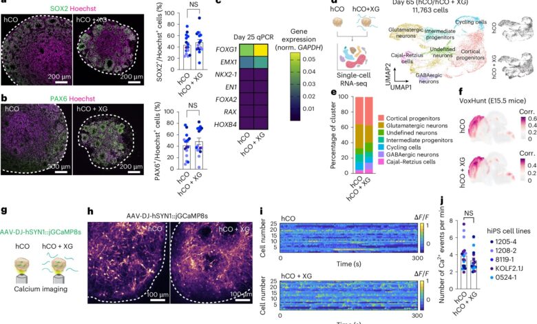Charakterizace kortikálních organoidů kultivovaných xanthanovou gumou. Kredit: Biomedicínské inženýrství přírody (2025). Dva: 10.1038/S41551-025-01427-3