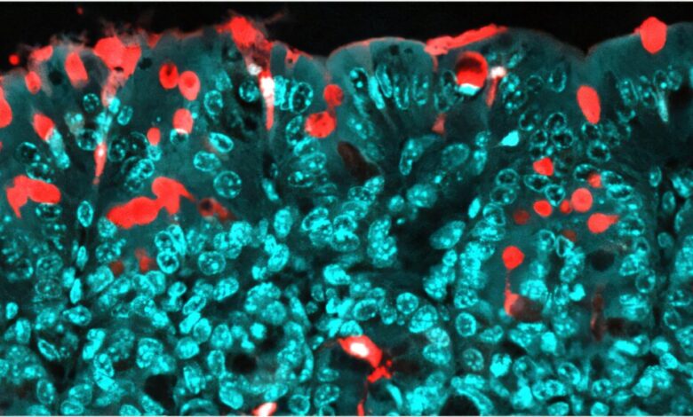 Molekuly procházející epitelem tlustého střeva prostřednictvím specializovaných cest (pohárkových buněk). V červené barvě: Molekuly přepravované. Kredit: Institut Pasteur/Microbiom-Host Interactions/Clara Delaroque a Benoit Chassaing