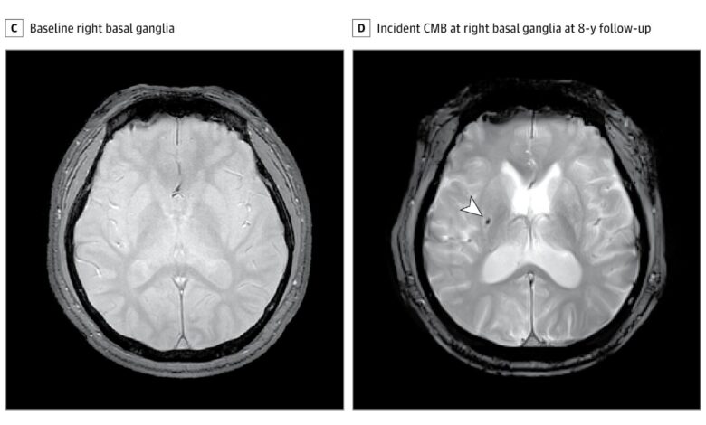 Snímky cerebrálního mikrokrvácení (CMB) ve výchozím stavu a následném sledování. Kredit: Otevřená síť JAMA (2025). DOI: 10.1001/jamanetworkopen.2025.39874
