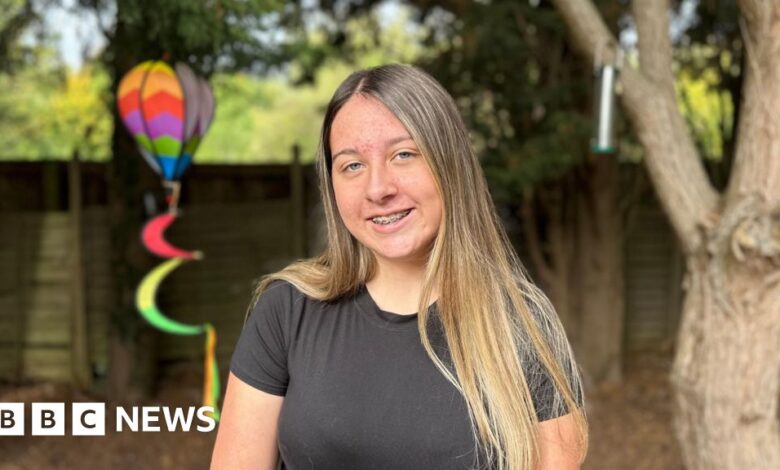 BBC 16letá dívka s dlouhými blond vlasy, se stříbrnými rovnátky a modrýma očima s úsměvem. Má na sobě černé tričko a stojí před nějakými zahradními ploty s pestrobarevným senzorickým balónkem v pozadí a kmenem stromu.BBC