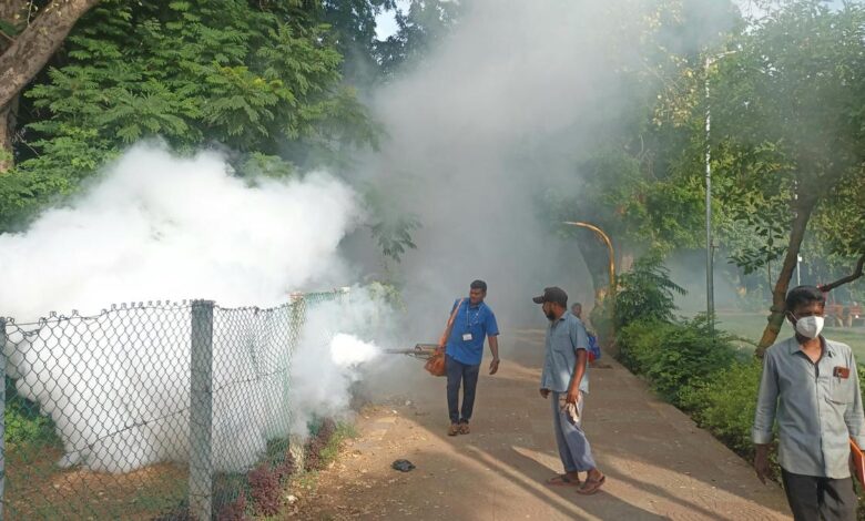 Zaměstnanci společnosti Greater Chennai Corporation zamlžují čtvrť, aby kontrolovali populaci komárů. Soubor | Fotografický kredit: The Hindu