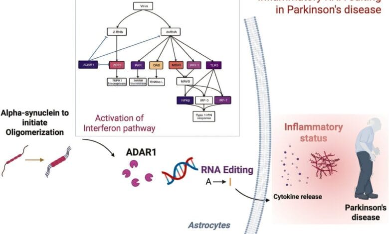 Zejména aktivita editace RNA ADAR1, která normálně funguje k regulaci imunitních odpovědí během Virové infekce Přeměnou adenosinu (A) na inosin (I) prostřednictvím procesu známého jako úpravy A-to-I RNA je zjištěno, že je abnormálně zaměřen na geny, které způsobují spíše zánět než za normálních podmínek. Tento jev byl pozorován nejen v neuronových modelech odvozených od pacientů, ale také v postmortálních mozkových tkáních od skutečných pacientů s Parkinsonovou chorobou.