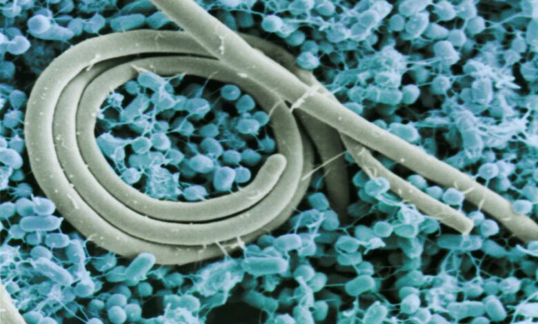 Barevný SEM (skenovací elektronový mikrograf) potravinářské patogen Salmonella enteritidis. Modrá je růstová střední. Obrázek je zbarven ve falešných barvách, aby ilustroval rozdíl. Foto od Jean Guard, Ars. Kredit: Americké oddělení zemědělství/veřejné domény