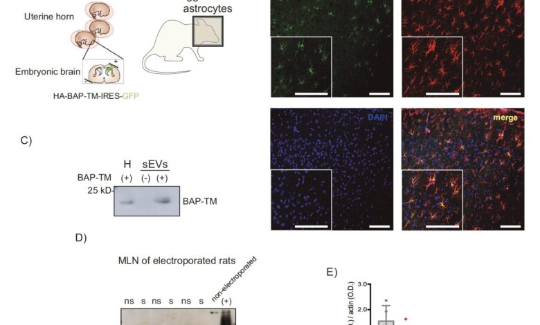„In-utero elektroporace provedená za účelem selektivní exprese membránového rekombinantního proteinu asociovaného s AsEV v astrocytech předního mozku potkana odhaluje, že tento protein je přenesen do střevní lymfoidní tkáně (GALT),“ napsali autoři.