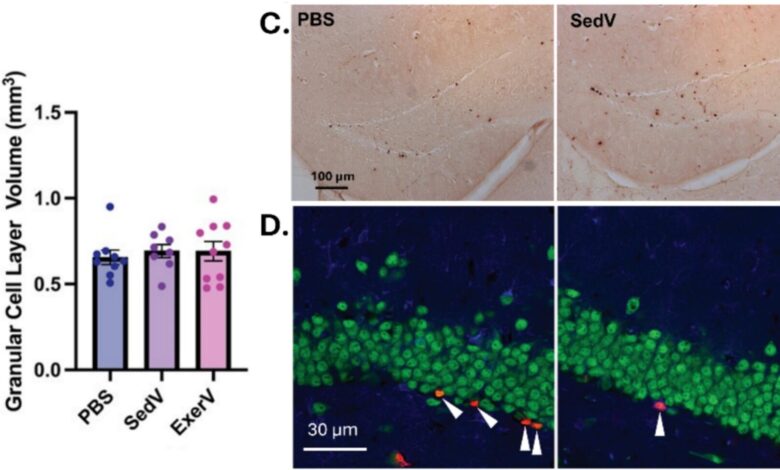 Sedavé recipientní myši, které dostávaly ExerV, vykazovaly silné zvýšení hipokampální neurogeneze u dospělých. ExerVs zvýšily hustotu BrdU-pozitivních buněk ve vrstvě granulárních buněk zhruba o 50 % ve srovnání se skupinami PBS i SedV.