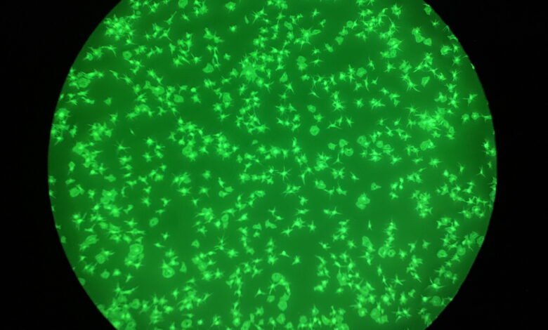 Mikroskopický obraz lidských destiček označených zelenou fluorescenční sloučeninou. Tyto destičky se neshluly do sraženin. Kredit: Rebecca Mellema