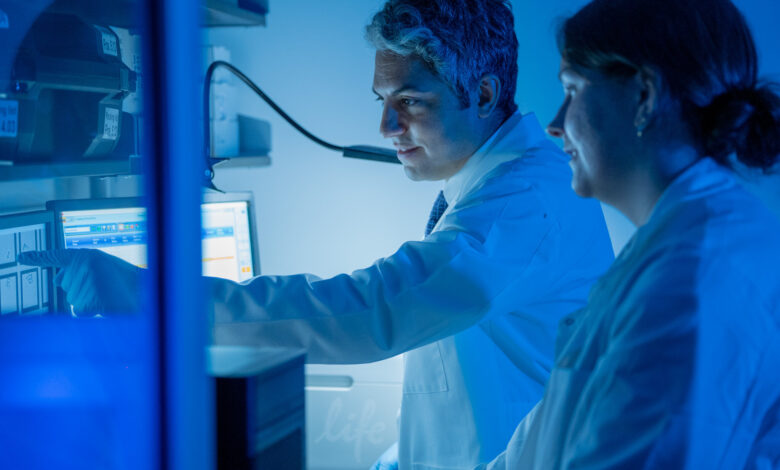 Elias Sayour (vlevo) pracuje v laboratoři. Kredit: UF Health/Jackie Hart