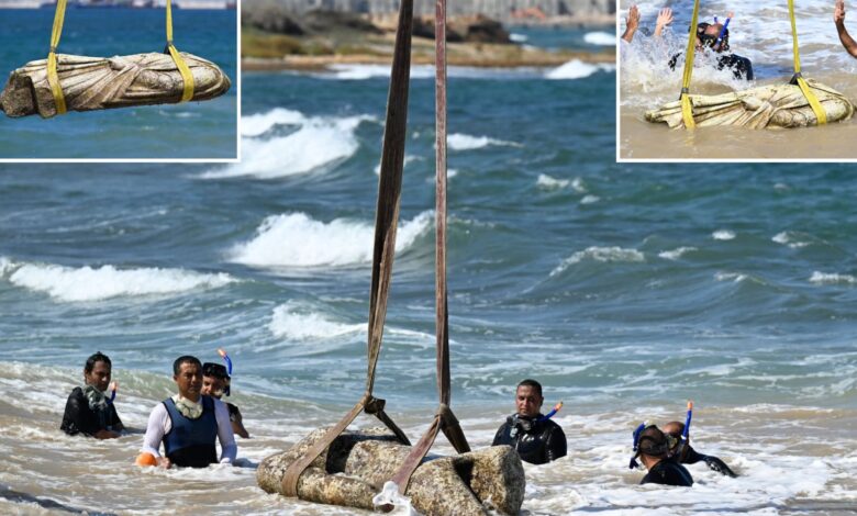 Ve čtvrtek 21. srpna jeřáby zvedly sochy z hlubin potopených ruin, zatímco potápěči pomáhali.