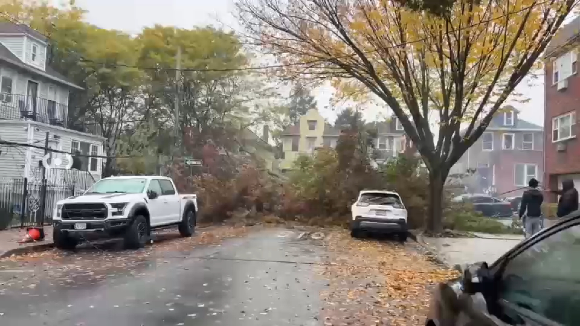Spadlý strom byl hlášen přes East 230th Street na Lowerre Place, v části Wakefield v Bronxu.