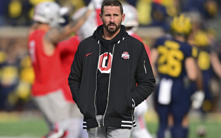 Ofenzivní koordinátor státu Ohio Brian Hartline stojí před vysokoškolským fotbalovým zápasem NCAA proti Michiganu, v sobotu 25. listopadu 2023 v Ann Arbor, Michigan. (AP Photo/David Dermer)