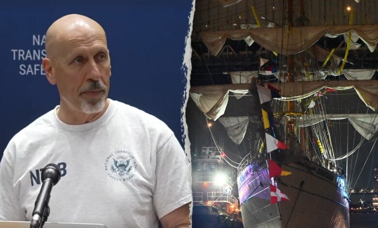Člen představenstva NTSB Michael Graham hovořil s reportéry o vyšetřování toho, co způsobilo, že mexická vysoká loď námořnictva v sobotu večer udeřila do Brooklynského mostu. (Fox News)