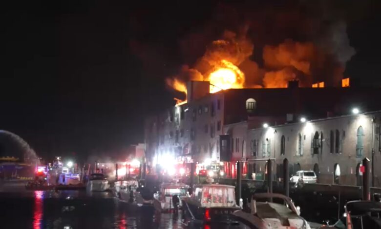 Hasiči, kteří byli vynuceni ze struktury plameny, bojovali s plamenem ze země a z vody a pomocí moří Fire Boat 9. Očekávají se, že tam budou celý den.