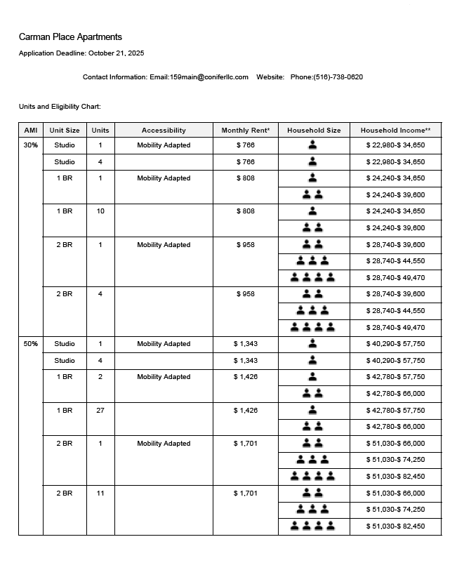 Klikněte zde Přihlásit se online prostřednictvím bydlení. Můžete také požádat o aplikaci telefonicky nebo e-mailem na 159Main@coniferllc.com nebo 631-471-1215.