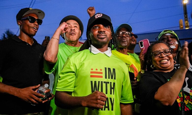 District of Columbia CouncilMember volit Trayon White, centrum, pumpuje pěst, když dorazí na svůj oddělení 8 speciálních volebních party, úterý 15. července 2025, ve Washingtonu, DC (AP Photo/Julia Demaree Nikhinson)
