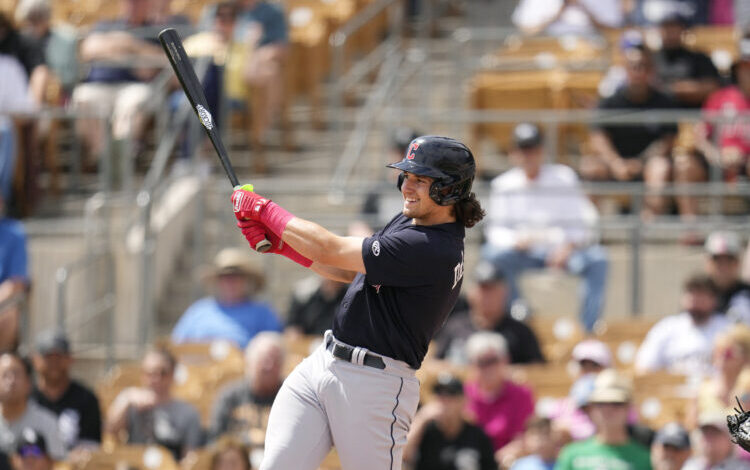 Cleveland Guardians ‚Chase Delauter následuje na svém houpačce na tří-běžeckém domácím běhu proti Chicago White Sox během první směny jarní tréninkové baseballové hry v pondělí 18. března 2024 ve Phoenixu. (AP Photo/Ross D. Franklin)