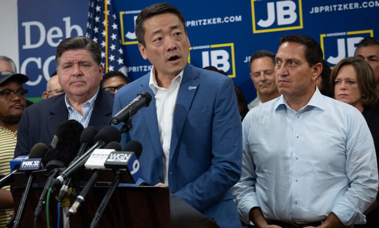 JB Pritzker, guvernér Illinois, vlevo a státní zástupce Gene Wu, demokrat z Texasu, během tiskové konference v Demokratické straně úřadu okresu Dupage v Carol Stream, Illinois, 3. srpna 2025.