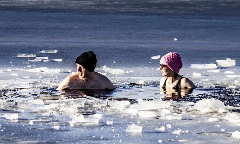 Divocí plavci se probíjejí ledem, aby se ponořili, zatímco Británie se připravuje na záplavy po skončení chladného období