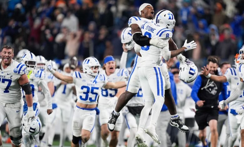 Duke’s Dan Mahan (12) slaví porážku Virginia Cavaliers během zápasu ACC Championship 2025 na Bank of America Stadium. (Jim Dedmon/Imagn Images)