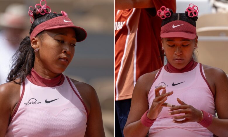 Naomi Osaka z Japonska zkoumá nehty při změně konců během jejího zápasu proti Paula Badosovi ve Španělsku druhý den na stadionu Roland Garros v Paříži 26. května 2025. (Susan Mullane-Imagn obrázky)